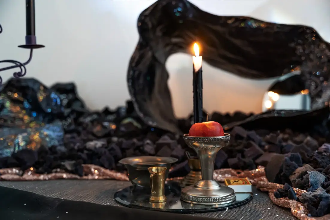 Mixed media installation: paper mache, chicken wire, acrylic paint, glitter, hand dyed foam, found fabric, found bottle, wire bracelet, spray paint, candle holders, candles, fire, found mirrors, found chalice and cauldron, sequin curtain, altered analog projector light.